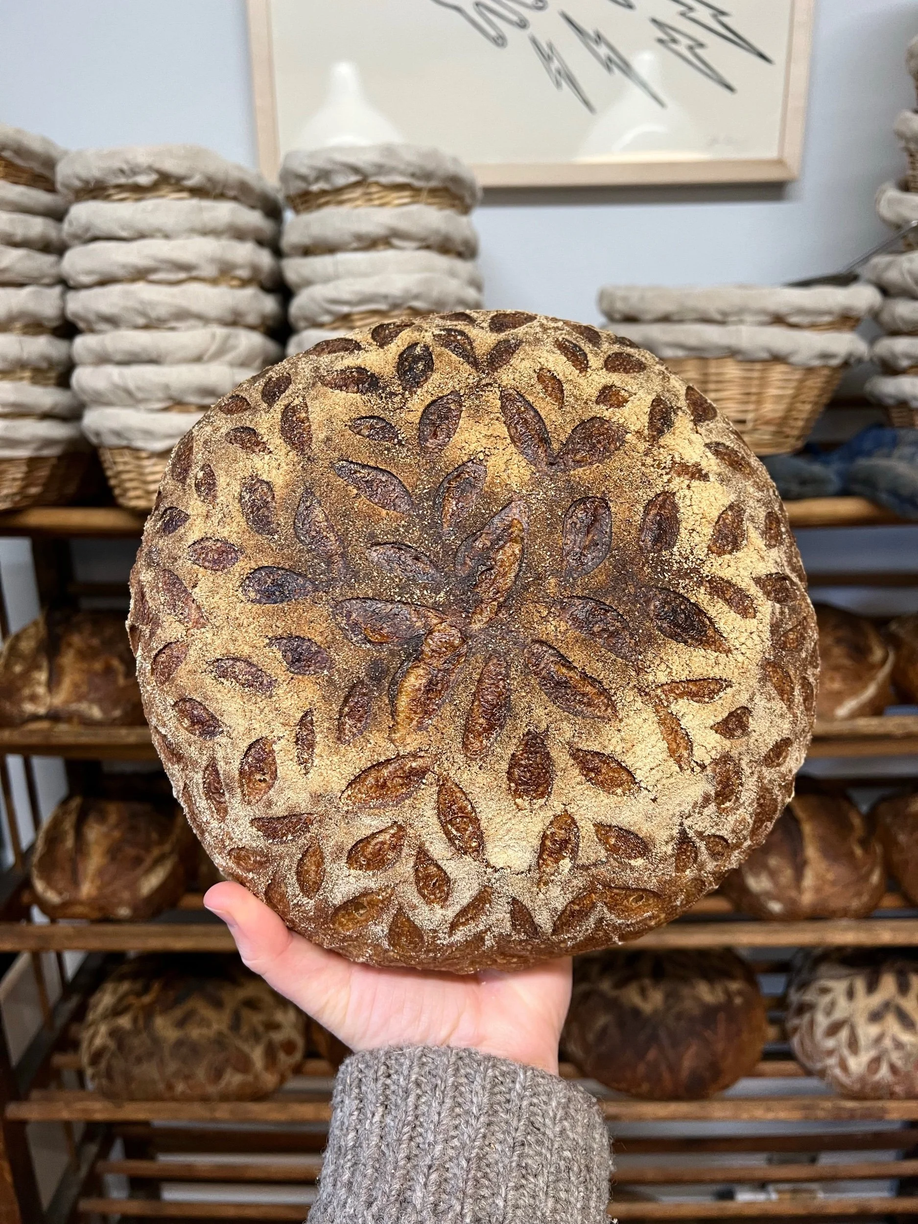 1.4kg of fanciful bread-y joy! This oversized, naturally leavened, lovingly adorned loaf is my nod to the old tradition of communal ovens and the big, hearty, long-lasting loaves they produced. Before electricity or the invention of white flour, miche were baked in the town’s communal wood fired oven and kept a family well-fed for an entire week before the oven was available again.